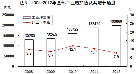 全年規(guī)模以上工業(yè)[7]中,農(nóng)副食品加工業(yè)增加值比上年增長(zhǎng)13.6%,紡織業(yè)增長(zhǎng)12.2%,通用設(shè)備制造業(yè)增長(zhǎng)8.4%,專(zhuān)用設(shè)備制造業(yè)增長(zhǎng)8.9%,汽車(chē)制造業(yè)增長(zhǎng)8.4%,計(jì)算機(jī)、通信和其他電子設(shè)備制造業(yè)增長(zhǎng)12.1%,電氣機(jī)械和器材制造業(yè)增長(zhǎng)9.7%。六大高耗能行業(yè)[8]增加值比上年增長(zhǎng)9.5%,其中,非金屬礦物制品業(yè)增長(zhǎng)11.2%,化學(xué)原料和化學(xué)制品制造業(yè)增長(zhǎng)11.7%,有色金屬冶煉和壓延加工業(yè)增長(zhǎng)13.2%,黑色金屬冶煉和壓延加工業(yè)增長(zhǎng)9.5%,電力、熱力生產(chǎn)和供應(yīng)業(yè)增長(zhǎng)5.0%,石油加工、煉焦和核燃料加工業(yè)增長(zhǎng)6.3%。高技術(shù)制造業(yè)增加值比上年增長(zhǎng)12.2%。