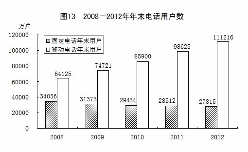 全年完成郵電業(yè)務(wù)總量[14]15022億元,比上年增長13.0%。其中,郵政業(yè)務(wù)總量2037億元,增長26.7%;電信業(yè)務(wù)總量12985億元,增長11.1%。郵政業(yè)全年完成郵政函件業(yè)務(wù)70.74億件,包裹業(yè)務(wù)0.69億件,快遞業(yè)務(wù)量56.85億件。電信業(yè)全年局用交換機(jī)容量新增478萬門,總?cè)萘?3906萬門;新增移動(dòng)電話交換機(jī)容量[15]11234萬戶,達(dá)到182870萬戶。年末固定電話用戶27815萬戶,其中,城市電話用戶18893萬戶,農(nóng)村電話用戶8922萬戶。新增移動(dòng)電話用戶12590萬戶,年末達(dá)到111216萬戶,其中3G移動(dòng)電話用戶[16]23280萬戶。年末全國固定及移動(dòng)電話用戶總數(shù)達(dá)到139031萬戶,比上年末增加11896萬戶。電話普及率達(dá)到103.2部/百人。互聯(lián)網(wǎng)上網(wǎng)人數(shù)5.64億人,其中寬帶上網(wǎng)人數(shù)5.30億人;ヂ(lián)網(wǎng)普及率達(dá)到42.1%。