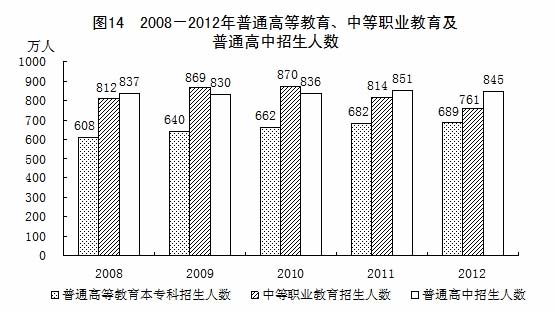 全年研究生教育招生59.0萬人,在學(xué)研究生172.0萬人,畢業(yè)生48.6萬人。普通高等教育本專科招生688.8萬人,在校生2391.3萬人,畢業(yè)生624.7萬人。各類中等職業(yè)教育招生761.0萬人,在校生2120.3萬人,畢業(yè)生673.6萬人。全國普通高中招生844.6萬人,在校生2467.2萬人,畢業(yè)生791.5萬人。全國初中招生1570.8萬人,在校生4763.1萬人,畢業(yè)生1660.8萬人。普通小學(xué)招生1714.7萬人,在校生9695.9萬人,畢業(yè)生1641.6萬人。特殊教育招生6.6萬人,在校生37.9萬人,畢業(yè)生4.9萬人。幼兒園在園幼兒3685.8萬人。