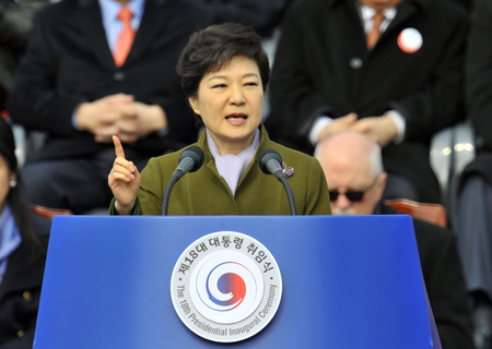 2月25日上午,韓國當(dāng)選總統(tǒng)樸槿惠在韓國國會議事堂前的國會廣場正式宣誓就任總統(tǒng)。 樸槿惠在就職演說中說,將以“經(jīng)濟振興”、“國民幸!焙汀拔幕d盛”三大核心理念為基礎(chǔ),為國民開啟一個充滿希望的新時代。樸槿惠說,政府將通過促進(jìn)創(chuàng)造型經(jīng)濟和經(jīng)濟民主化來重振經(jīng)濟。她表示,為實現(xiàn)國民幸福,政府將改善社會福利,解決養(yǎng)老、育兒問題,并改善教育制度。