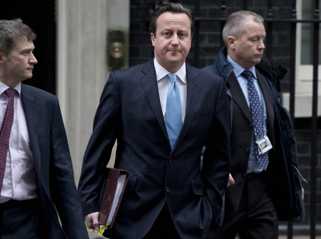 圖為英國首相卡梅倫27日正離開唐寧街10號首相官邸,準(zhǔn)備參加國會下議院的質(zhì)詢會議。 針對英國主權(quán)債務(wù)日前被信用評級機構(gòu)穆迪下調(diào),當(dāng)天卡梅倫對議會表示,“評級下調(diào)提醒我們應(yīng)該更快更大規(guī)模的實施減赤措施!27日發(fā)布的英國2012年國內(nèi)生產(chǎn)總值增長率為0.2%,高于市場預(yù)期的零增長。