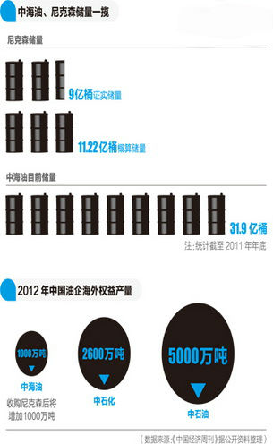 雖然成本巨大,但長遠(yuǎn)看來,中海油這次收購的利潤也很豐厚。有媒體引用中石油經(jīng)濟(jì)技術(shù)研究院的報告稱,中海油對尼克森的收購,將使其油氣凈產(chǎn)量較2011年增長22%,達(dá)到5500萬噸,而其海外權(quán)益油氣產(chǎn)量也將比2012年翻番,達(dá)到2000萬噸。
