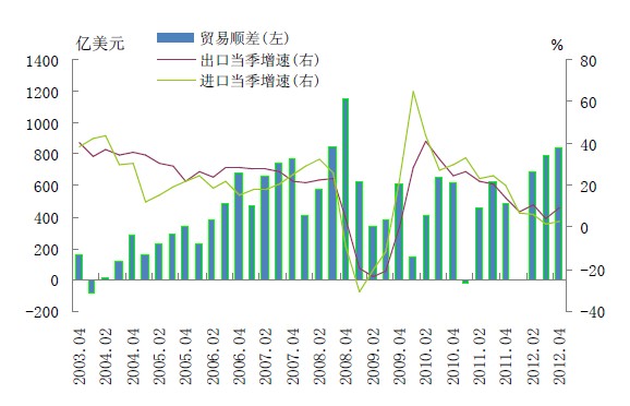 受國際大宗商品價格總體下跌等因素影響,進口價格下降。2012年各季度,紐約商品交易所原油期貨當(dāng)季平均價格分別環(huán)比上漲9.5%、-9.4%、-1.2%和-4.3%,累計下降6.2%。2012
