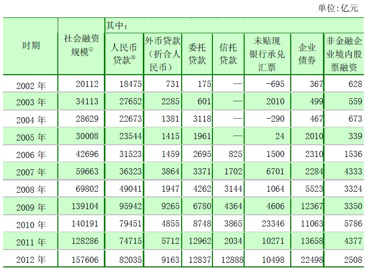 初步統(tǒng)計,2012 年全年社會融資規(guī)模為15.76