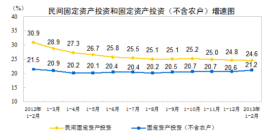 2013年1-2月份,全國民間固定資產(chǎn)投資15777億元,同比名義增長24.6%,增速比去年全年回落0.2個百分點(diǎn)。民間固定資產(chǎn)投資占固定資產(chǎn)投資的比重為61.4%,與去年全年持平。