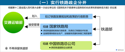 國務(wù)院機構(gòu)改革和職能轉(zhuǎn)變方案提出,實行鐵路政企分開,完善綜合交通運輸體系。近些年,鐵路實現(xiàn)了跨越式發(fā)展,保障了國民經(jīng)濟平穩(wěn)運行和人民生產(chǎn)生活需要,但也存在政企不分、與其他交通運輸方式銜接不暢等問題。為推動鐵路建設(shè)和運營健康可持續(xù)發(fā)展,保障鐵路運營秩序和安全,充分發(fā)揮各種交通運輸方式的整體優(yōu)勢和組合效率,有必要實行鐵路政企分開,加快推進綜合交通運輸體系建設(shè)。