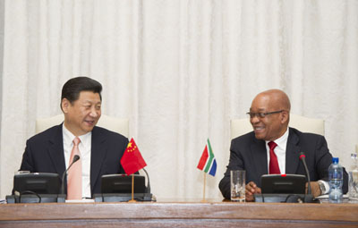 國家主席習(xí)近平26日在比勒陀利亞同南非總統(tǒng)祖馬舉行會(huì)談。習(xí)近平指出,中國支持南非辦好金磚國家領(lǐng)導(dǎo)人第五次會(huì)晤以及金磚國家同非洲國家領(lǐng)導(dǎo)人對(duì)話會(huì),愿同南方一道,加強(qiáng)金磚國家合作,推動(dòng)金磚國家加強(qiáng)對(duì)非合作。