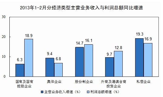 1-2月份在規(guī)模以上工業(yè)企業(yè)中,國(guó)有及國(guó)有控股企業(yè)實(shí)現(xiàn)利潤(rùn)2125億元,比去年同期增長(zhǎng)18.9%;集體企業(yè)實(shí)現(xiàn)利潤(rùn)106億元,增長(zhǎng)6.8%;股份制企業(yè)實(shí)現(xiàn)利潤(rùn)4102億元,增長(zhǎng)16.1%;外商及港澳臺(tái)商投資企業(yè)實(shí)現(xiàn)利潤(rùn)1592億元,增長(zhǎng)12.8%;私營(yíng)企業(yè)實(shí)現(xiàn)利潤(rùn)2306億元,增長(zhǎng)16.9%。