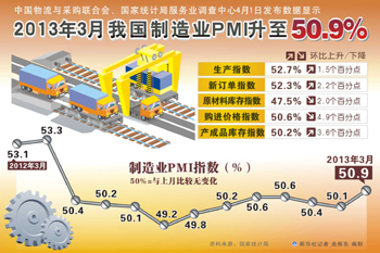 中國物流與采購聯(lián)合會、國家統(tǒng)計局服務(wù)業(yè)調(diào)查中心4月1日發(fā)布,3月份中國制造業(yè)采購經(jīng)理指數(shù)(PMI)為50.9%,較上月上升0.8個百分點,連續(xù)6個月保持在50%以上。