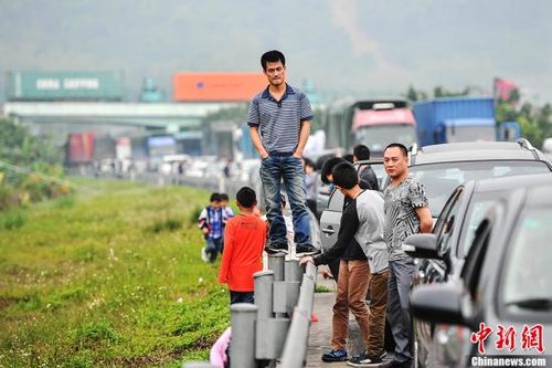 4月3日,深汕高速廣東海豐縣鲘門鎮(zhèn)至陸豐縣一段因交通事故和車流密集等原因造成長達(dá)數(shù)十公里的擁堵,高速公路儼然“變身”停車場(chǎng)。不少車主停車占用應(yīng)急車道。圖為汽車乘客下車休息。洪堅(jiān)鵬