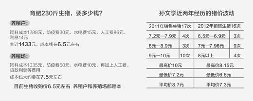 豬價(jià)不穩(wěn),對(duì)養(yǎng)殖戶而言并非新鮮事。在孫文學(xué)的賬本上,記錄著近兩年的生豬價(jià)格波動(dòng)情況:2011年銷售生豬17次,7.2元—7.9元4次,8元—8.9元3次,9元—10元10次,最高價(jià)10元,最低價(jià)7.2元,平均價(jià)8.7元;2012年銷售生豬16次,6.5元—6.9元3次,7元—7.96元9次,8元以上4次,最高價(jià)8.15元,最低價(jià)6.6元,平均價(jià)7.3元。