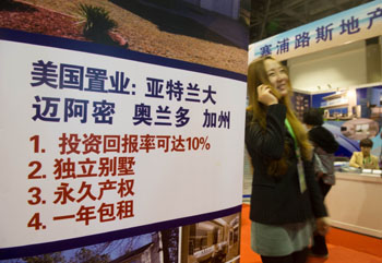為期四天的2013年北京春季房地產(chǎn)展示交易會(huì)日前在北京展覽館開幕。本次房展共集結(jié)國(guó)內(nèi)外項(xiàng)目五百余個(gè)。圖為一名參觀者從北京春季房展會(huì)上一處海外購(gòu)房移民的展示牌前走過(guò)。記者
