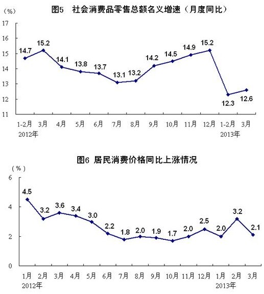 一季度,社會(huì)消費(fèi)品零售總額55451億元,同比名義增長(zhǎng)12.4%(扣除價(jià)格因素實(shí)際增長(zhǎng)10.8%),增速比上年同期回落2.4個(gè)百分點(diǎn),比上年全年回落1.9個(gè)百分點(diǎn)。其中,限額以上企業(yè)(單位)消費(fèi)品零售額27045億元,同比增長(zhǎng)10.3%。按經(jīng)營(yíng)單位所在地分,城鎮(zhèn)消費(fèi)品零售額47894億元,同比增長(zhǎng)12.2%;鄉(xiāng)村消費(fèi)品零售額7557億元,增長(zhǎng)13.9%。按消費(fèi)形態(tài)分,餐飲收入5890億元,同比增長(zhǎng)8.5%,增速比上年同期回落4.8個(gè)百分點(diǎn),比上年全年回落5.1個(gè)百分點(diǎn);商品零售49561億元,增長(zhǎng)12.9%,分別回落2.1和1.5個(gè)百分點(diǎn)。在商品零售中,限額以上企業(yè)(單位)商品零售額25170億元,增長(zhǎng)11.1%。其中,汽車類增長(zhǎng)6.4%,增速比上年同期回落4.6個(gè)百分點(diǎn);家具類增長(zhǎng)22.4%,回落3.0個(gè)百分點(diǎn);家用電器和音像器材類增長(zhǎng)16.7%,加快16.1個(gè)百分點(diǎn)。3月份,社會(huì)消費(fèi)品零售總額同比名義增長(zhǎng)12.6%(扣除價(jià)格因素實(shí)際增長(zhǎng)11.7%),環(huán)比增長(zhǎng)1.23%。