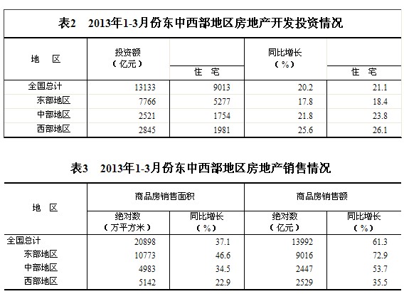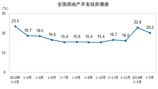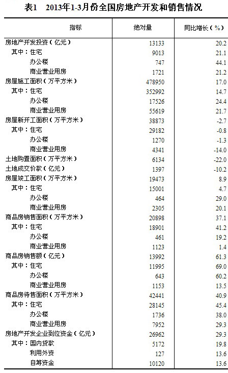 2013年1-3月份,全國房地產(chǎn)開發(fā)投資13133億元,同比名義增長20.2%(扣除價(jià)格因素實(shí)際增長19.9%),增速比1-2月份回落2.6個(gè)百分點(diǎn)。其中,住宅投資9013億元,增長21.1%,增速回落2.3個(gè)百分點(diǎn),占房地產(chǎn)開發(fā)投資的比重為68.6%。