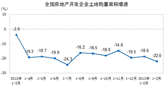 1-3月份,房地產(chǎn)開發(fā)企業(yè)土地購置面積6134萬平方米,同比下降22.0%,降幅比1-2月份擴(kuò)大3.4個(gè)百分點(diǎn);土地成交價(jià)款1397億元,下降10.2%,降幅縮小1.8個(gè)百分點(diǎn)。