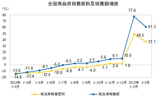 1-3月份,商品房銷售面積20898萬平方米,同比增長37.1%,