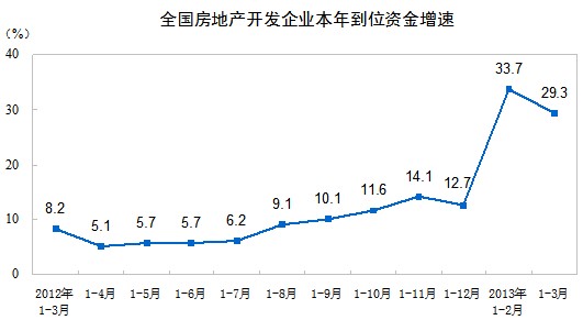 1-3月份,房地產(chǎn)開發(fā)企業(yè)到位資金26962億元,同比增長29.3%,增速比1-2月份回落4.4個(gè)百分點(diǎn)。其中,國內(nèi)貸款5172億元,增長19.8%;利用外資127億元,增長13.6%;自籌資金10120億元,增長13.6%。