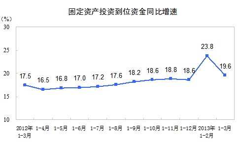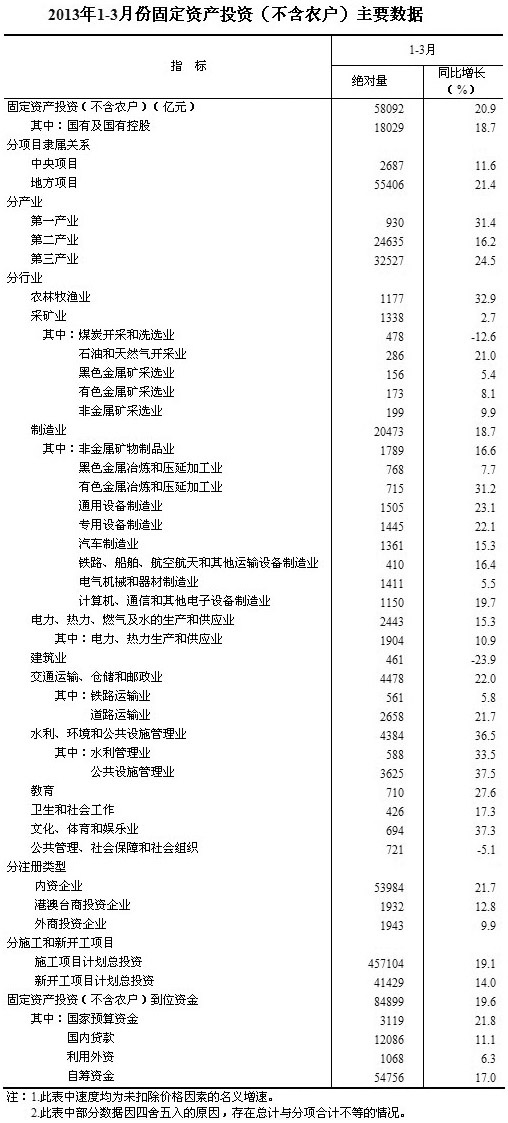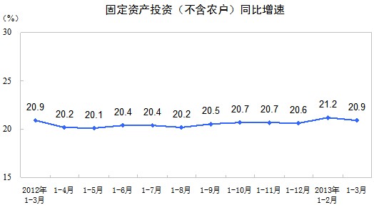 2013年1-3月份,全國固定資產(chǎn)投資(不含農(nóng)戶)58092億元,同比名義增長20.9%(扣除價(jià)格因素實(shí)際增長20.7%),增速比1-2月份回落0.3個(gè)百分點(diǎn),與去年同期持平。從環(huán)比看,3月份固定資產(chǎn)投資(不含農(nóng)戶)增長1.59%。