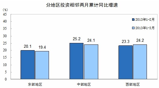 分地區(qū)看,1-3月份,東部地區(qū)投資30349億元,同比增長19.4%,增速比1-2月份回落0.7個(gè)百分點(diǎn);中部地區(qū)投資14275億元,增長24.1%,增速回落1.1個(gè)百分點(diǎn);西部地區(qū)投資13122億元,增長24.2%,增速加快0.9個(gè)百分點(diǎn)。