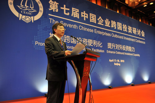 在第七屆中國企業(yè)跨國投資研討會上,中國貿(mào)促會會長萬季飛發(fā)表講話。張慧娟