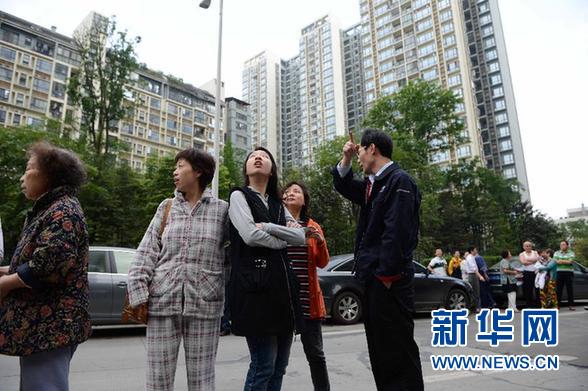 4月20日,成都市一小區(qū)居民在樓下避震。新華社記者 李橋橋 攝