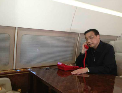 4月20日,在飛往四川途中,李克強(qiáng)總理召開緊急會議,部署抗震救災(zāi)工作。到達(dá)機(jī)場后,李克強(qiáng)總理一行分乘四架直升飛機(jī),飛往震中。圖為李克強(qiáng)與四川省委書記王東明通電話。(圖片來源:新華視點(diǎn)微博)
