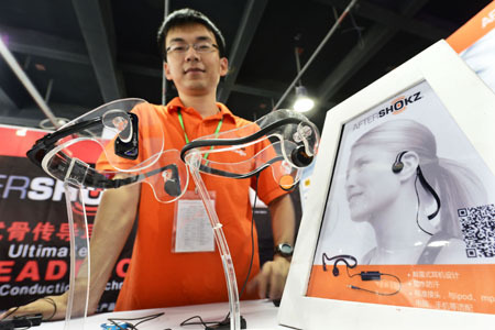 第七屆中國杭州電子信息博覽會近日在杭州和平國際會展中心舉行。圖為工作人員在展示兩款不傷聽力的“雙耳開放骨傳導(dǎo)式耳機”。