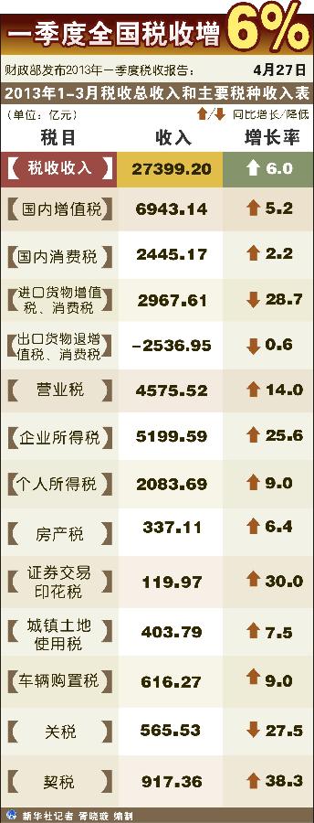 財政部27日發(fā)布2013年一季度稅收報告顯示,今年前三個月全國稅收總收入完成27399.20億元,比去年同期增長6%,增速回落了4.3個百分點,其中部分主體稅種出現(xiàn)負(fù)增長,而房地產(chǎn)相關(guān)稅收收入則出現(xiàn)反彈。