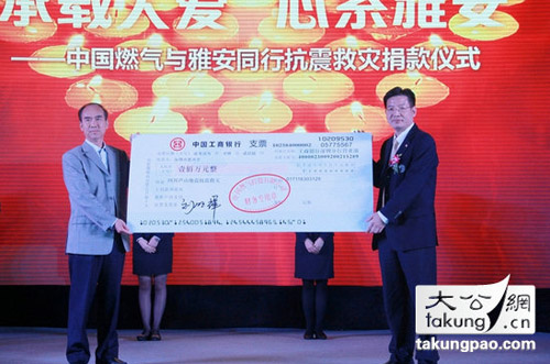 4月26日,中國燃氣在深圳舉行2013財年工作會議,并在現(xiàn)場舉行了“承載大愛,心系雅安——中國燃氣與雅安同行”的抗震救災(zāi)捐款儀式。集團執(zhí)行總裁黃勇代表中國燃氣親自將100萬元善款交到了深圳市政協(xié)副主席、深圳市慈善會副會長姚欣耀的手中。
