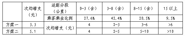 (2)對(duì)乘客影響。按照當(dāng)前平均運(yùn)距測(cè)算,方案一乘客每運(yùn)次平均增支約3.3元,增幅約13%;方案二乘客每運(yùn)次平均增支約5.1元,增幅約20%。對(duì)不同乘距乘客影響具體見(jiàn)下表: