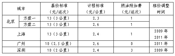 方案一:基價(jià)標(biāo)準(zhǔn)由10元/3公里調(diào)整為13元/3公里;計(jì)程標(biāo)準(zhǔn)由2元/公里調(diào)整為2.3元/公里。燃油附加費(fèi)由3公里以上運(yùn)次加收3元調(diào)整為全部運(yùn)次加收1元。