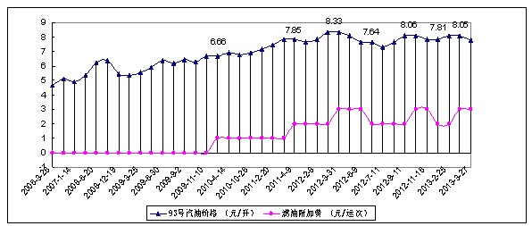 2013年3月27日,國(guó)家發(fā)展改革委出臺(tái)了成品油價(jià)格機(jī)制完善方案,將成品油調(diào)價(jià)周期由現(xiàn)行22個(gè)工作日縮短至10個(gè)工作日,并取消了國(guó)際市場(chǎng)油價(jià)波動(dòng)4%才能調(diào)價(jià)的幅度限制。新機(jī)制運(yùn)行后,成品油調(diào)價(jià)頻率加快。為適應(yīng)新的油價(jià)調(diào)整機(jī)制,降低油價(jià)頻繁變動(dòng)對(duì)行業(yè)和社會(huì)的影響,本市現(xiàn)行燃油附加費(fèi)動(dòng)態(tài)調(diào)整機(jī)制需進(jìn)一步完善。