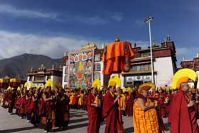 屆時,巨型強巴佛唐卡將在壇城大殿前徐徐展開,接受虔誠的信眾拋獻(xiàn)哈達(dá)。當(dāng)法號齊鳴、法鑼合奏,上千名身著嶄新僧袍的僧人列隊走出措欽大殿,徑直走向寺廟中央的空地,集體誦經(jīng)祈福。