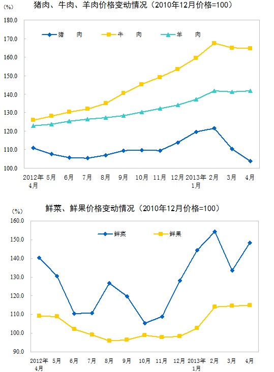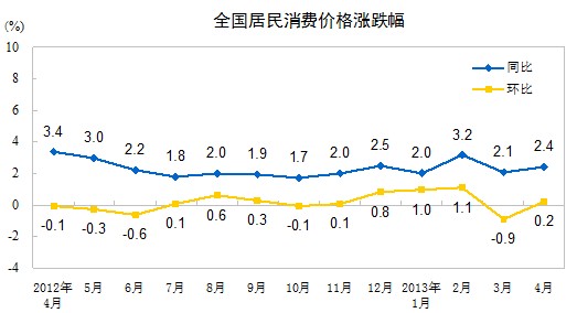 2013年4月份,全國(guó)居民消費(fèi)價(jià)格總水平同比上漲2.4%。其中,城市上漲2.4%,農(nóng)村上漲2.4%;食品價(jià)格上漲4.0%,非食品價(jià)格上漲1.6%;消費(fèi)品價(jià)格上漲2.2%,服務(wù)價(jià)格上漲2.9%。1-4月平均,全國(guó)居民消費(fèi)價(jià)格總水平比去年同期上漲2.4%。