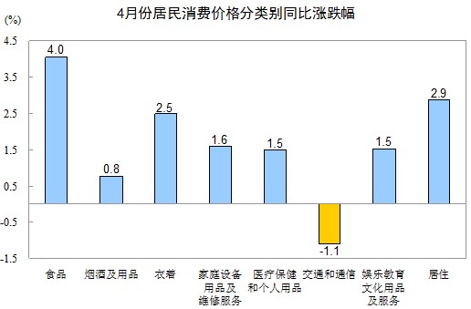 4月份,食品價(jià)格同比上漲4.0%,影響居民消費(fèi)價(jià)格總水平同比上漲約1.33個(gè)百分點(diǎn)。其中,鮮菜價(jià)格上漲5.9%,影響居民消費(fèi)價(jià)格總水平上漲約0.20個(gè)百分點(diǎn);糧食價(jià)格上漲5.2%,影響居民消費(fèi)價(jià)格總水平上漲約0.15個(gè)百分點(diǎn);肉禽及其制品價(jià)格上漲1.5%,影響居民消費(fèi)價(jià)格總水平上漲約0.11個(gè)百分點(diǎn)(豬肉價(jià)格下降6.5%,影響居民消費(fèi)價(jià)格總水平下降約0.21個(gè)百分點(diǎn));鮮果價(jià)格上漲5.3%,影響居民消費(fèi)價(jià)格總水平上漲約0.11個(gè)百分點(diǎn);油脂價(jià)格上漲3.8%,影響居民消費(fèi)價(jià)格總水平上漲約0.05個(gè)百分點(diǎn);水產(chǎn)品價(jià)格上漲2.0%,影響居民消費(fèi)價(jià)格總水平上漲約0.05個(gè)百分點(diǎn)。