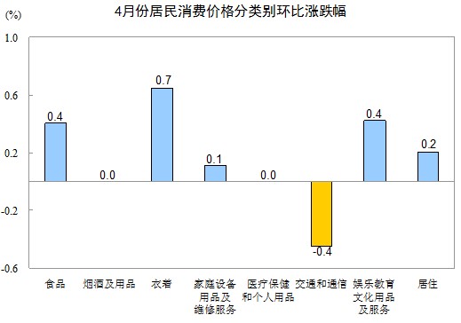4月份,非食品價(jià)格環(huán)比上漲0.2%,影響居民消費(fèi)價(jià)格總水平環(huán)比上漲約0.10個(gè)百分點(diǎn)。其中,衣著、娛樂教育文化用品及服務(wù)、居住、家庭設(shè)備用品及維修服務(wù)價(jià)格環(huán)比分別上漲0.7%、0.4%、0.2%和0.1%,交通和通信價(jià)格環(huán)比下降0.4%,煙酒及用品、醫(yī)療保健和個(gè)人用品價(jià)格環(huán)比均持平(漲跌幅度為0)。水、電、燃料中,液化石油氣價(jià)格環(huán)比下降1.1%。