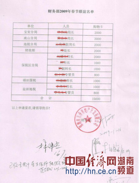 在另一份有萬澤地產(chǎn)林偉光董事長簽字并加蓋公章的2009年春節(jié)聯(lián)誼單上顯示,收受禮品的官員分別有寶安分局林某某局長、南山分局黃某某局長、地稅分局王某某副局長、財(cái)政部鄧處長、保稅區(qū)分局劉某某科長,均收禮2000元,保稅區(qū)分局林科長、羅副科長、福田國稅孫某某科長、鹽田地稅李某某科長,均收禮1000元,保稅區(qū)分局楊小姐專管員、鹽田地稅李先生專管員,均收禮800元。