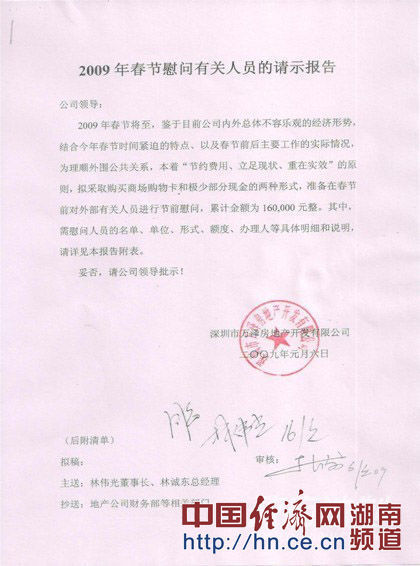 近日,一封長達(dá)10多頁的匿名信件被曝光,該信件主要內(nèi)容為深圳萬澤地產(chǎn)2008年中秋節(jié)前至今,多年向北京市、深圳市多部門多官員送禮的請示報(bào)表與執(zhí)行清單。其中該清單中明確注明送禮方式為贈送購物卡和現(xiàn)金兩種形式,對收禮人員的名單、單位、形式、額度、辦理人等具體明細(xì)均有說明。在這些報(bào)表的右下方,有該公司公章與萬澤地產(chǎn)董事長林偉光的批示!