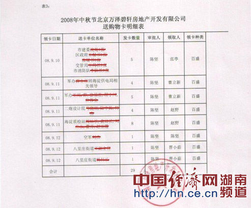 在2008年中秋節(jié)萬澤地產(chǎn)分公司即北京萬澤碧軒房地產(chǎn)開發(fā)有限公司贈送購物卡明細(xì)表里可以清晰的看到,9月10日,贈送市建委沈處、區(qū)政府王秘書、張秘書、交管局王局長等共4張;9月11日,贈送海淀質(zhì)檢站閻站長、曲站長、劉某某、董某、趙某某等共8張;9月12日,贈送八里莊街道王副主任、八里莊街道楊科長等共3張……