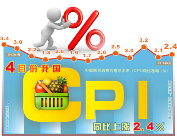 國家統(tǒng)計局9日公布,4月份全國居民消費價格總水平(CPI)同比上漲2.4%,同比漲幅比3月份擴大0.3個百分點,略高于此前市場2.2%至2.3%的預期,環(huán)比也由3月份的環(huán)比下降轉(zhuǎn)為4月份的環(huán)比上漲0.2%。多方分析認為,鮮菜價格上漲較多是推動4月份CPI上漲的主要原因,受制于經(jīng)濟回升乏力,二季度物價將保持小幅平穩(wěn)上漲態(tài)勢。但是,考慮到豬肉價格很可能從三季度開始顯著上行,國內(nèi)外貨幣環(huán)境也依舊寬松,下半年物價加速上漲的概率仍然較大。