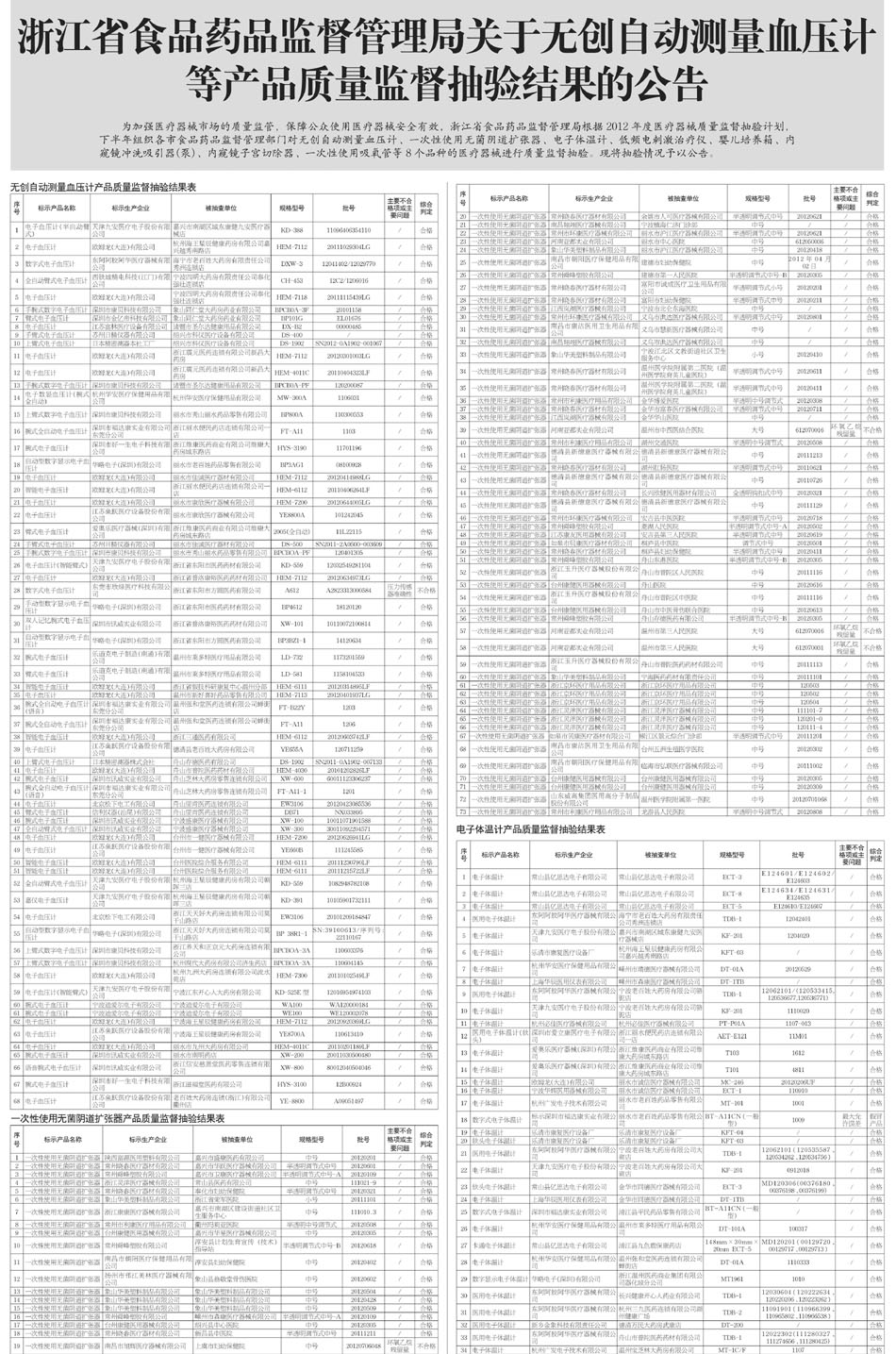 浙江省食品藥品監(jiān)督管理局關于無創(chuàng)自動測量血壓計等產(chǎn)品質(zhì)量監(jiān)督抽驗結(jié)果的公告