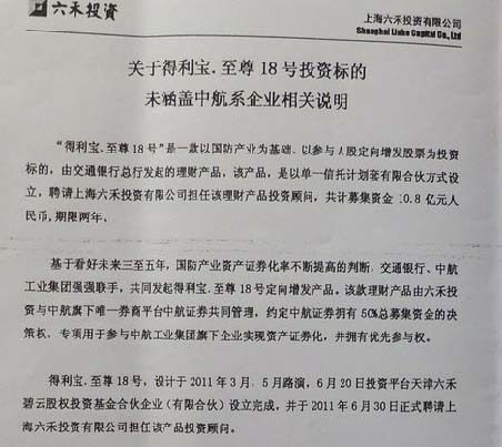 關(guān)于“得利寶?至尊18號”投資標(biāo)的為何沒有涵蓋中航系企業(yè),六禾投資也曾做出書面解釋,表示是因為中航集團整日資產(chǎn)證券化推進緩慢,投資無法完成,因此才改變投資標(biāo)的。但這一解釋并不為投資者所接受。