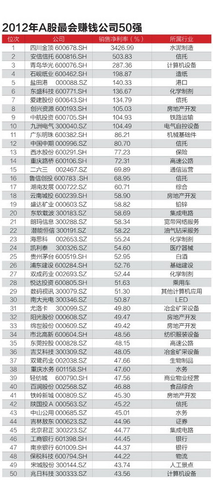 再看看“2012年A股最會(huì)賺錢公司50強(qiáng)”。