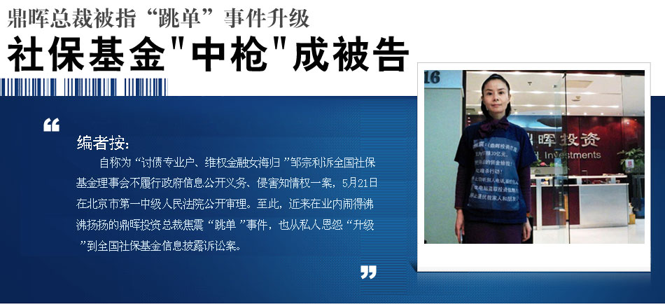 鼎暉聲明,“天津?qū)毝ν顿Y中心”不是“另起爐灶”;鼎暉相關(guān)負(fù)責(zé)人致電本報(bào),稱(chēng)焦震自鄒宗利所指時(shí)間至今,僅赴蒙古國(guó)烏蘭巴托一次并非鉛鋅礦產(chǎn)項(xiàng)目所在地,同時(shí)表示愿意出示相關(guān)證據(jù)。 “我告全國(guó)社保基金,并不是針對(duì)鼎暉!5月21日下午,某投資公司合伙人鄒宗利在北京市第一中級(jí)人民法院庭審結(jié)束后,接受媒體記者采訪時(shí)如是說(shuō)。(4月26日,《經(jīng)濟(jì)參考報(bào)》曾以《社;稹爸袠尅背杀桓妗⊥癸@信息公開(kāi)尷尬》為題,獨(dú)家報(bào)道了鄒宗利指責(zé)鼎暉總裁焦震“跳單”、訴全國(guó)社;鹄硎聲(huì)拒不公開(kāi)相關(guān)信息案立案一事,引起廣泛關(guān)注。)
