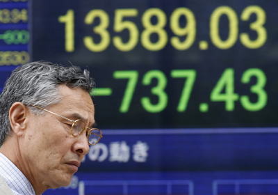 圖為當日,一名男子走過日本東京一家證券公司的股票價格顯示屏。