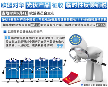 一石激起千層浪。歐盟委員會(huì)4日宣布,歐盟將從6月6日起對(duì)產(chǎn)自中國(guó)的光伏產(chǎn)品征收11.8%的臨時(shí)反傾銷稅,如果雙方未能在8月6日前達(dá)成妥協(xié)方案,屆時(shí)反傾銷稅率將升至47.6%。歐委會(huì)不顧多方反對(duì),執(zhí)意對(duì)華光伏征稅,這在中國(guó)和歐盟引發(fā)了強(qiáng)烈的反對(duì)浪潮。