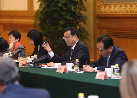 6月5日,國(guó)務(wù)院總理李克強(qiáng)在人民大會(huì)堂同出席2013財(cái)富全球論壇和出席全球首席執(zhí)行官委員會(huì)的企業(yè)家代表會(huì)見(jiàn)并座談。