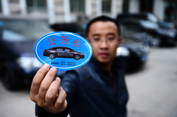 青海省某單位一名駕駛員在展示領(lǐng)取的公務(wù)用車標(biāo)識(shí)。記者 張宏祥/攝 |
