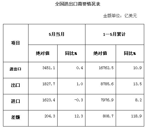 5月當(dāng)月,我國進出口總值2.15萬億元人民幣(折合3451.1億美元),增長0.4%。其中出口1.14萬億元人民幣(折合1827.7億美元),增長1.0%;進口1.01萬億元人民幣(折合1623.4億美元),下降0.3%;貿(mào)易順差1278.4億元人民幣(折合204.3億美元)。