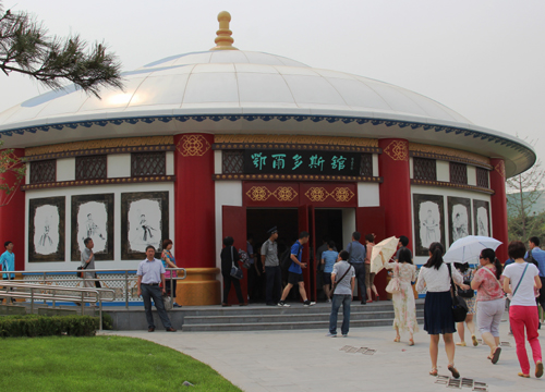 鄂爾多斯展園位于園博園西南側(cè),總占地面積8400平方米,面對北京主展館,臨近上海園、合肥園和唐山園,是位置最突出、面積最大、內(nèi)容最豐富的展園之一。展園以蒙元文化和草原文化為基調(diào),突出鄂爾多斯特有的地域性、民族性和多元性,整體布局充分利用原有地勢,結(jié)合周邊場館環(huán)境,形成大開大合、高低錯落、疏朗有致的園林風格。展園植物選擇鄉(xiāng)土樹種二十八種,主要包括家榆、旱柳、紅柳、沙柳、沙棗、沙地柏、檸條、馬藺等,都是耐旱、耐寒、耐瘠薄的優(yōu)選植物。園內(nèi)主體建筑由一個鋼結(jié)構蒙古包、一個氈包和一個原生態(tài)敖包組成,三個圓形建筑各具特色,相互呼應,以開放熱情的姿態(tài)迎接四面八方來客。主館鄂爾多斯館建筑面積320平米,外立面藍白相間、雕欞映襯,館內(nèi)展陳結(jié)合、聲光互補,集中展示鄂爾多斯城市園林綠化建設成果和經(jīng)濟社會文化各項事業(yè)發(fā)展成就。